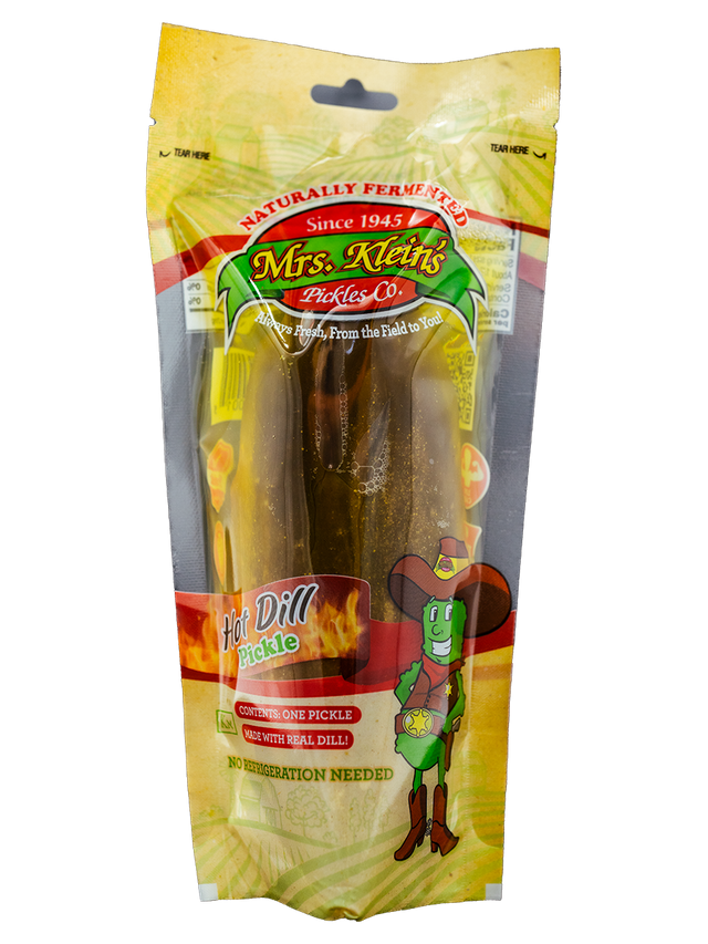 When the craving hits, turn up the heat with Mrs. Klein’s Single Serve Hot Dill Pickle. Each large, individually wrapped pickle is naturally cured in a fiery hot brine and infused with zesty yellow hot chilito encurtidos peppers for a bold, crave-worthy kick.