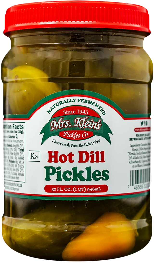 Experience a fiery twist on a timeless favorite with Mrs. Klein’s Hot Dill Pickles. These naturally cured dill pickles are packed with crunch, then steeped in a bold, zesty hot brine infused with vibrant yellow hot peppers to deliver a satisfying heat that builds with every bite.